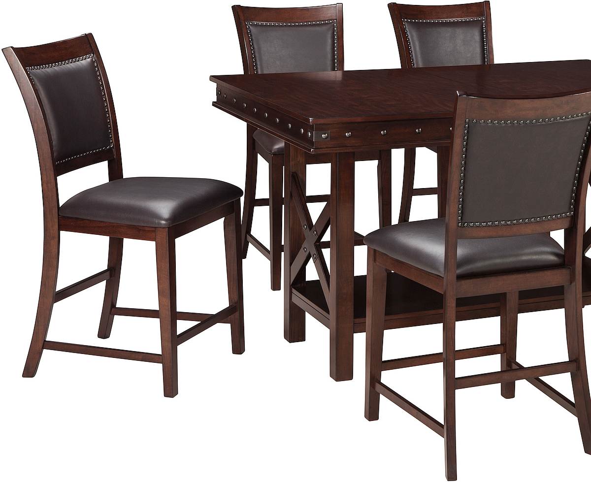 Made with Birch veneer and Rubberwood solids in dark brown finish. Table has a substantial base with shelf and x-motif end panel. Aprons have tall effect with nail head detailing. Barstool has inset upholstered back with a dark brown PVC cover and accented with nail head detailing.Read More