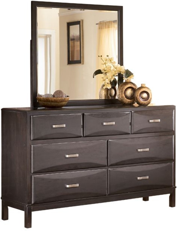 With its sculpted overlay drawer fronts, the Kira dresser and mirror set carves out contemporary style in a fresh, new way. Its sophisticated, dark finish is given even more character with sculptural hardware in an aged bronze tone. Seven-drawer design packs great form and function.