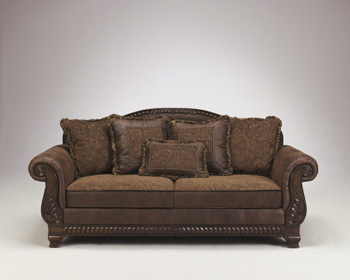 The rich elegant design of the "Bradington-Truffle" upholstery collection brings together beautiful upholstery and exquisite details to create the ultimate in traditional styled furniture. The sweeping rolled arms and pillow back design of the upholstery is artistically adorned with exemplary detailed showood that scrolls beautifully throughout this collection. With the comfort of supportive cushions and a variety of soft upholstery fabrics, this collection maintains a cozy atmosphere while perfectly capturing the essence of traditional design. Add a sophisticated style to your living room decor with the beauty and comfort of the "Bradington-Truffle" upholstery collection.