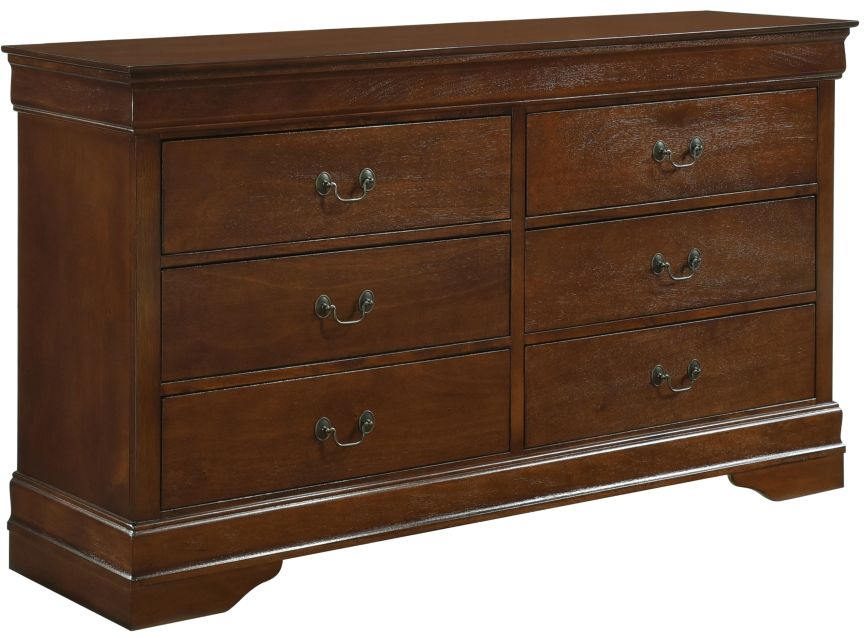 Traditional in design and modest in scale, the elegant Mayville collection takes its design inspiration from the classic Louis Philippe styling. The okume veneer of the dresser is paired with a brown cherry finish and is accentuated by antique brass tone drop handles.Read More