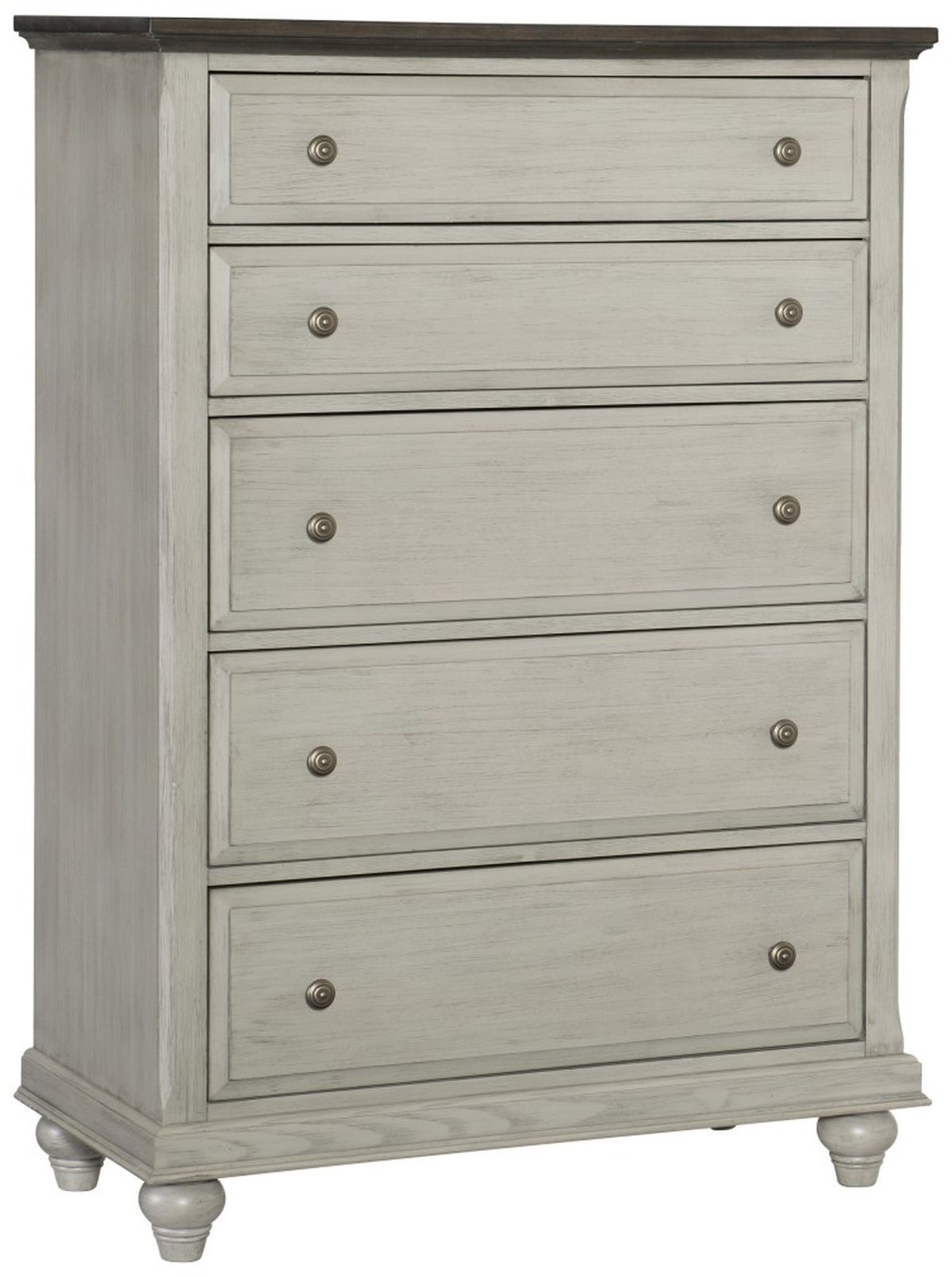 In nod to modern farmhouse design, the Mossbrook Collection features a classic profile that will be a perfect addition to your home’s décor. The pine solids and oak veneer of the collection feature a light gray finish, subtly highlighting the wood’s grain. The dark brown top of the chest provides contrast, as do the dark metal pulls that front the drawers.